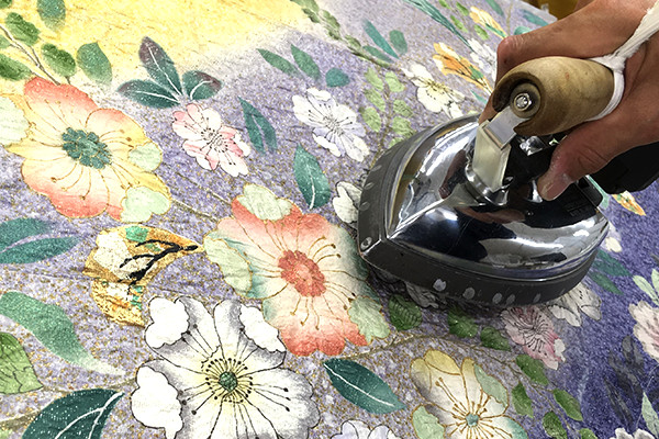 仕上げは、専用の蒸気アイロンと、余分な蒸気を吸い込むアイロン台で、着物のシワをアイロンを浮かせ、最少の蒸気で伸ばしながら、ふっくらと仕上げていきます。