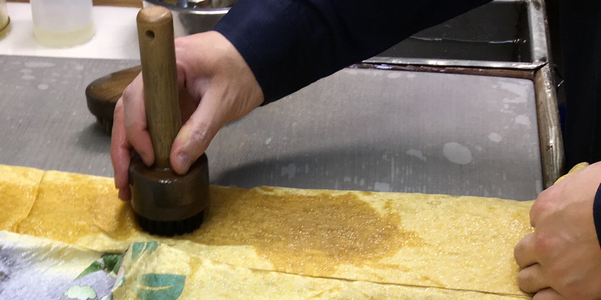 仕上げは、専用の蒸気アイロンと、余分な蒸気を吸い込むアイロン台で、着物のシワをアイロンを浮かせ、最少の蒸気で伸ばしながら、ふっくらと仕上げていきます。