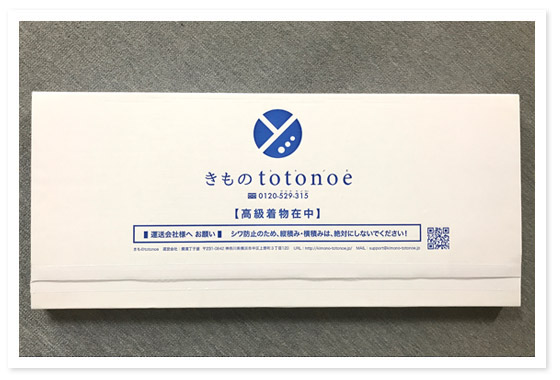 シワや偏りが極力抑えられた状態で届けられるように、きものtotonoeのロゴの入った専用の白い運送箱にてお送りします。